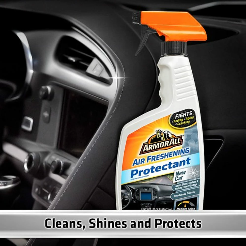 Keep your car interior looking and feeling like new with Armor All Air Freshening Car Protectant. In just one step, this air freshening formula cleans, protects and adds shine with trusted Armor All protection with New Car scent. Formulated to renew vinyl, rubber and plastic, Armor All protectant helps restore the appearance of surfaces while helping to prevent fading and cracking. This car cleaning spray leaves a beautiful shine, helping your car stay looking great. Apply this non-greasy auto spray to the dashboard, console, panels and vinyl seats to revitalize your auto interior. Other car care products may call themselves protectant, but only one can call itself Armor All!