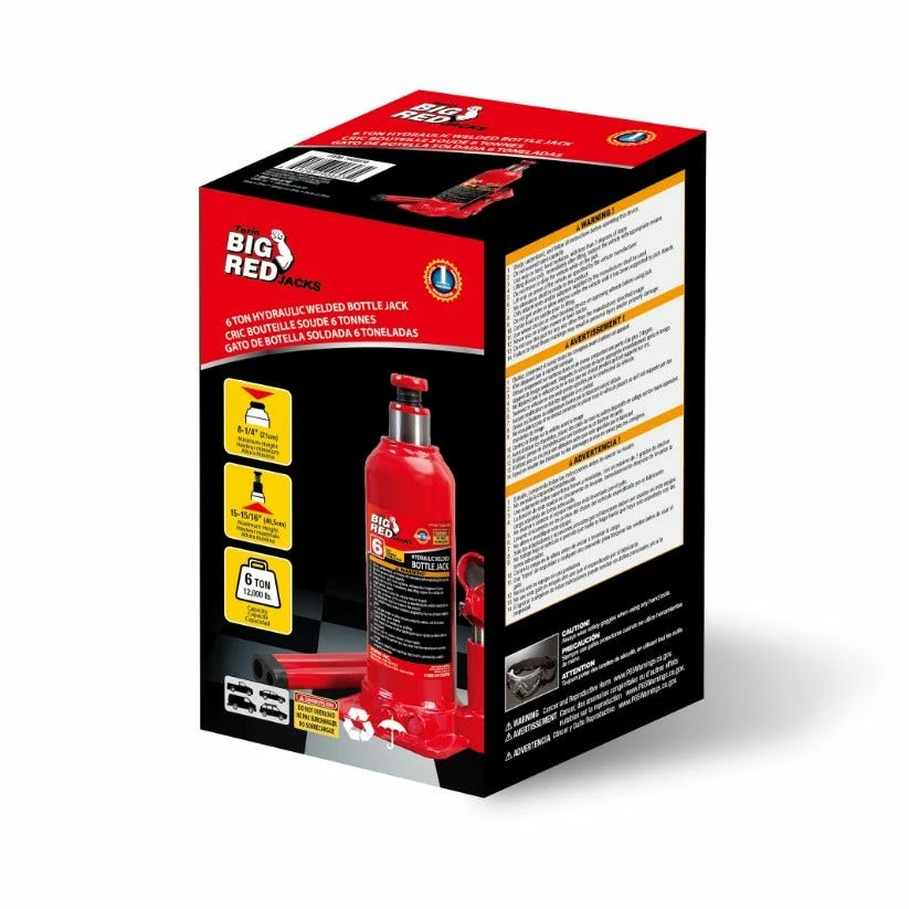 The BIG RED 6 Ton bottle jack is ideal for auto, truck service, farm, and garage use. It has a lifting range of 8-1/8″ to 15-13/16″ with a 6 ton (12,000 lb.) capacity. The welded base reduces the oil leaking rate of this bottle jack and ensures long life performance. The wide, rugged base adds stability and strength while the extension screw top design allows this bottle jack to adjust to the desired work height easily. The built-in oil-bypass and overload valve that protects the hydraulic system from extending beyond limits. Meets ASME PASE safety standards and includes a limited 1 year manufacturer warranty.