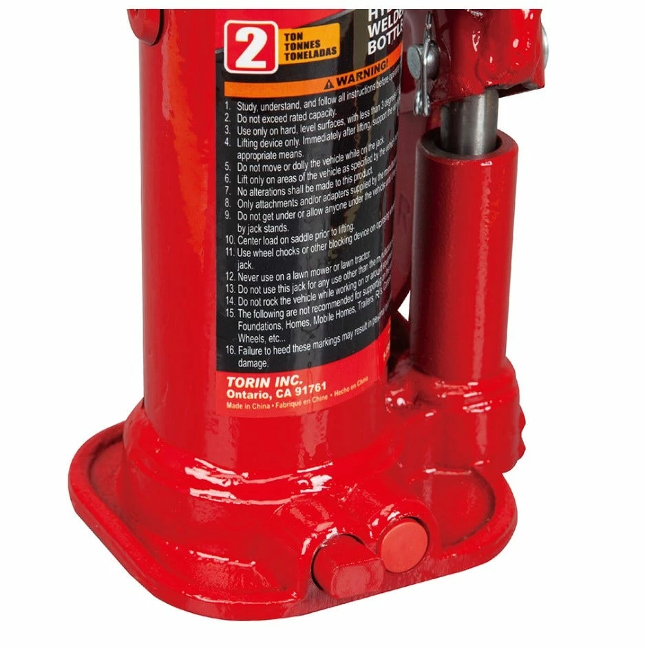 The BIG RED 2 Ton bottle jack in red color is ideal for auto, truck service , farm, and garage use. It has a lifting range of 7-1/8 ” to 113-5/8 ” with a 2 ton (4,000 lb) capacity. The welded base reduces the oil leaking rate of this bottle jack and ensures long life performance. The wide, rugged base adds stability and strength while the extension screw top design allows this bottle jack adjust to accommodate the desired work height easily. Built-in oil-bypass and overload valve that protects the hydraulic system from extending beyond limits. Meets ASME PASE safety standards and includes a limited 1 year manufacturer warranty.
