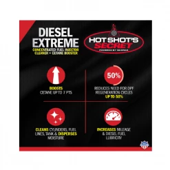 Dirt and water in your fuel system steal the power from your diesel. Your engine needs an extreme cleaning. Hot Shot’s Secret Diesel Extreme is a new and powerful formula designed to rejuvenate your diesel’s fuel system’s performance. Add a dose of Diesel Extreme at your next fill up and your engine’s fuel system will be cleaned, restored and boosted to its original performance power. Diesel Extreme will clean everything in your tank, lines and injector tips and remove moisture. When used in conjunction with Hot Shot’s Secret Stiction Eliminator you will be giving your truck a complete cleaning on the inside. Stiction Eliminator is cleaning the oil side of the engine while Diesel Extreme cleans the fuel side. This product contains anti-oxidants and is not formulated for use in gasoline engines.