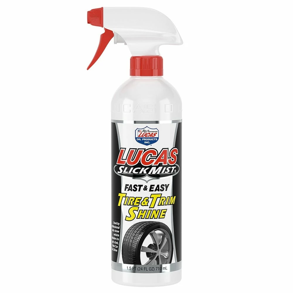 Lucas Slick Mist Tire & Trim Shine is a treatment spray exclusively formulated by Lucas Oil Products designed to give Tires and Trim a long lasting “like-new” shine. Use Slick Mist Tire Shine to remove dull, grey oxidation from Bumpers, Tires, Plastic, or any Rubber and Vinyl Trim.