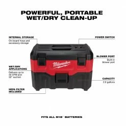 The M18â„¢ 2-Gallon Wet/Dry Vacuum provides users with a Powerful and Portable Wet/Dry Clean-up tool.