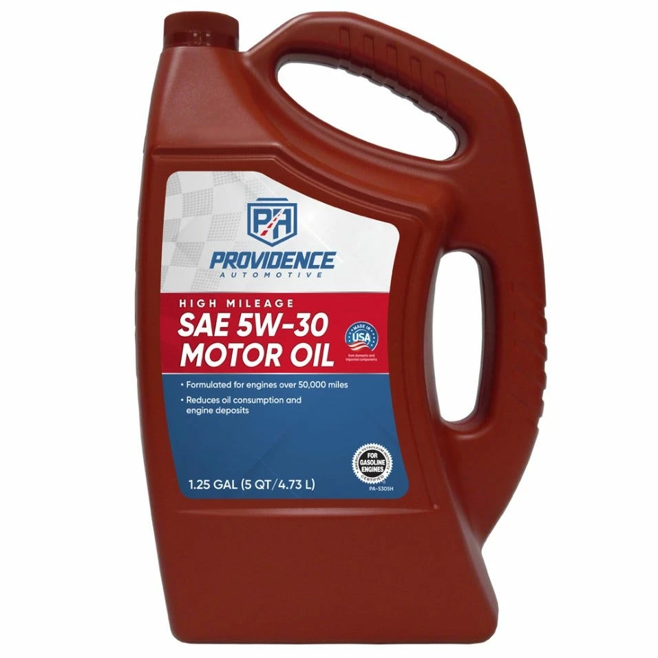 Providence Automotive High Mileage Motor Oils are premium passenger car motor oils formulated to protect older engines with 50,000 miles or more. They are available in SAE 5W-20, SAE 5W-30, and SAE 10W-30 viscosity grades. They are blended with high viscosity index mineral oils compounded to provide protection against wear and corrosion, prevent oxidative thickening and inhibit formation of engine acids, sludge and varnish deposits. API SN PLUS helps prevent pre-ignition and wear, and provides improved cleanliness and fuel economy.