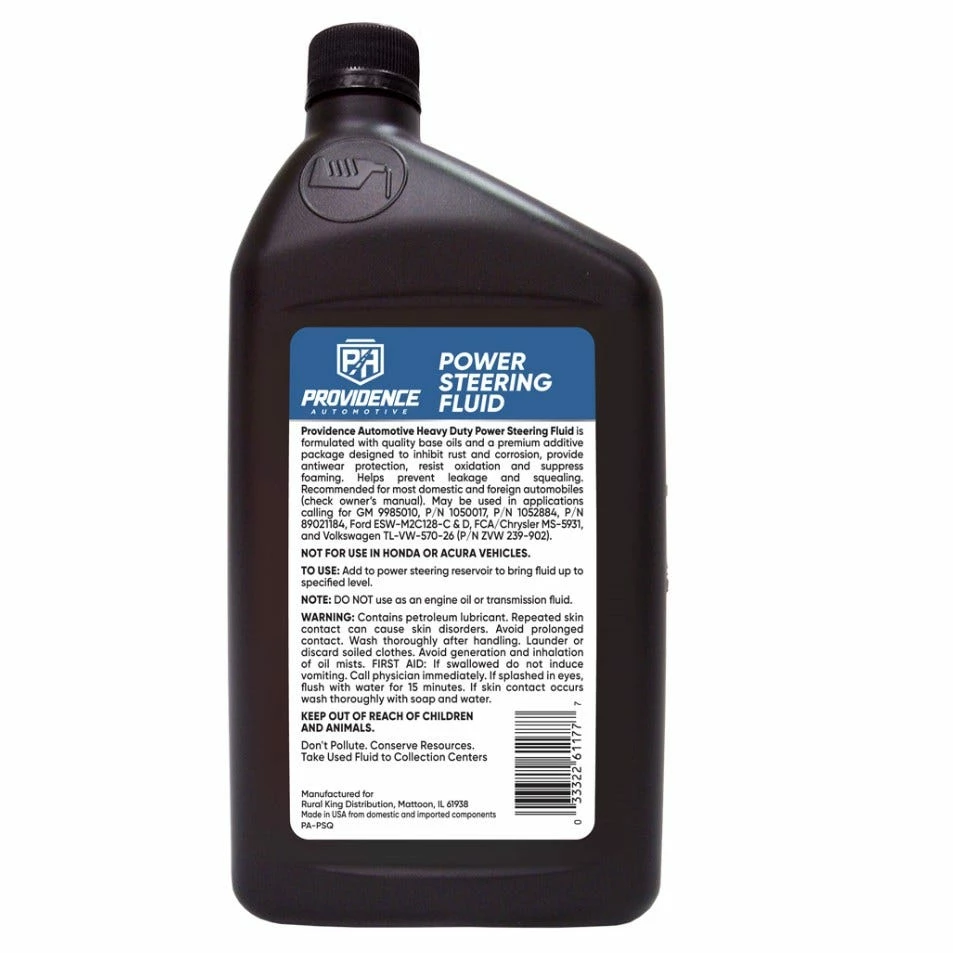Providence Automotive Heavy Duty Power Steering Fluid helps maintain the performance, condition, and efficiency of power steering units. It features Anti-wear protection. Rust and oxidation inhibitor. Anti-wear protection. Prevents squeals and protects seals and hoses.